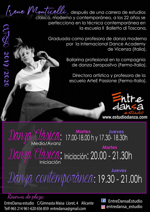 Irene Monticelli será la nueva profesora de Danza Contemporánea y Danza Clásica. Una gran profesional que nos hará vibrar en sus clases con su energía y su pasión por la danza.